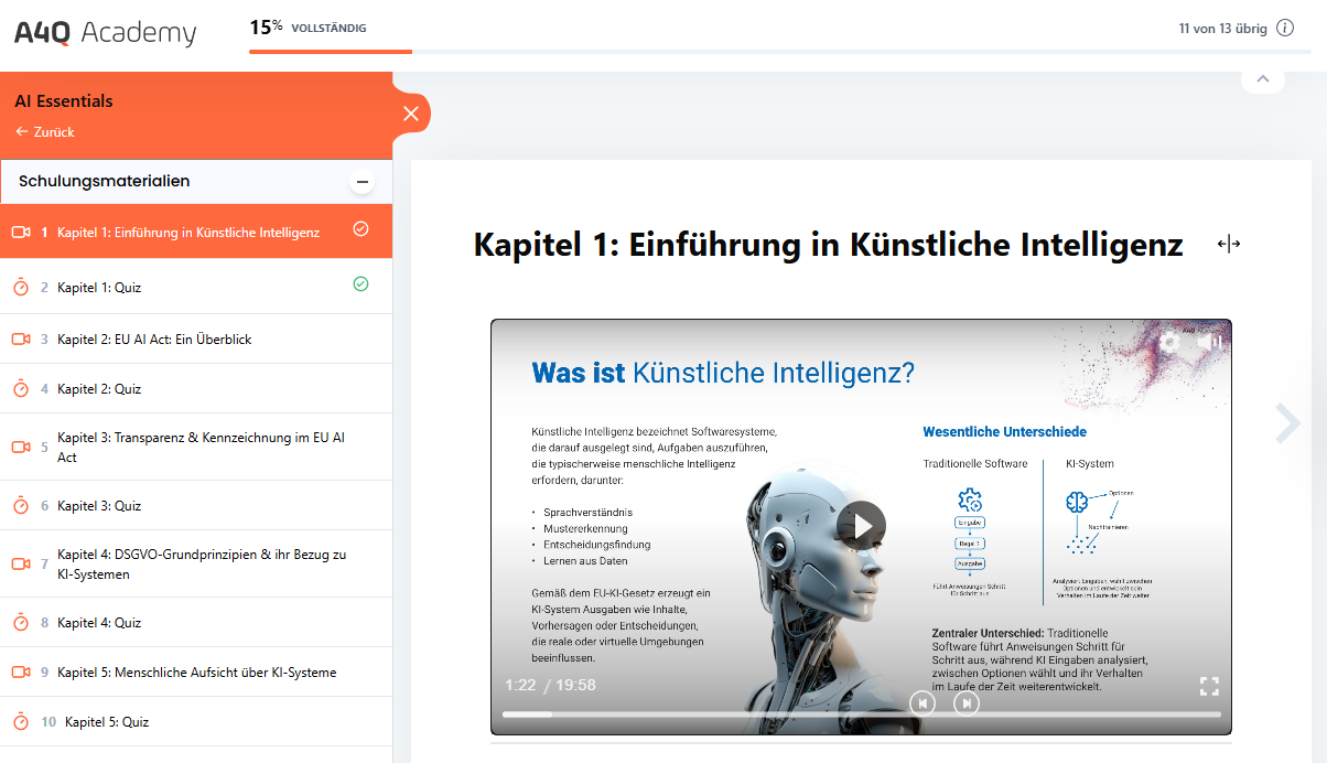 The "A4Q AI Essentials" e-learning (online self-study) and certification provides an introduction to AI compliance, ethics and risk awareness; no prior technical knowledge is required. It provides individuals and teams with the necessary knowledge to: